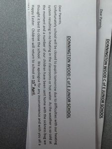 School closure March 27, 2013March 27, 2013 | donningtonwood Unfortunately, due to a major fault with the heating, the school will have to close tomorrow. Related