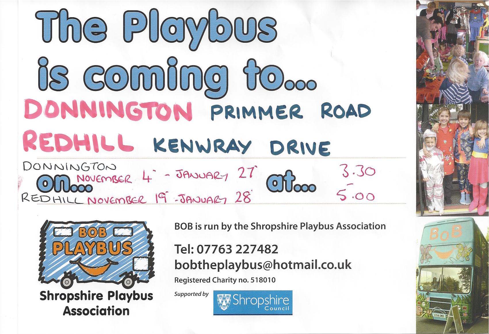 9. Bob the Playbus: Coming to Primmer Road in Donnington and Kenwray drive in Redhill on 27th & 28th January