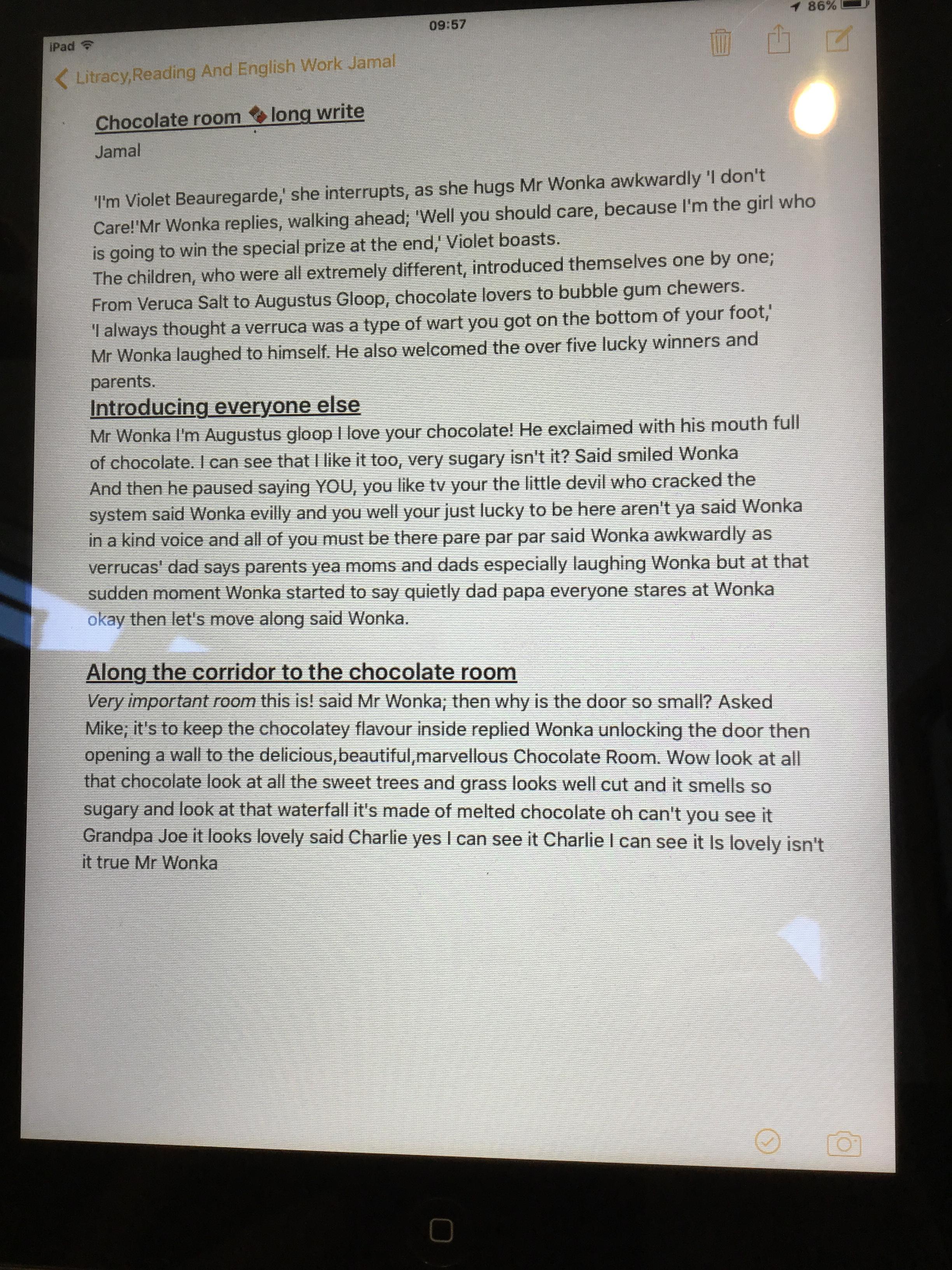 Well done Jamal October 18, 2018October 18, 2018 | donningtonwood Linking to their topic, year 6 have bee; writing about chocolate! Jamal will edit and improve this work before he presents it in his book. Sent from my iPad Related