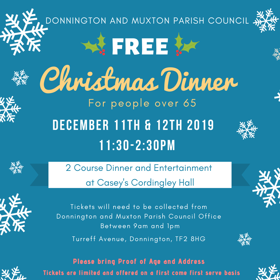 Tickets are still available for the free Christmas Dinner (two course meal with entertainment) that we’re putting on at Caseys on the 11th and 12th of December, for over 65’s in Donnington and Muxton. (Details attached).
