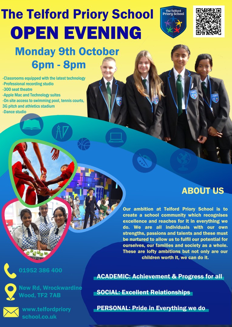 Telford Priory School Open Evening September 25, 2023 | donningtonwood Good morning, Please find attached flyer promoting our Open Evening. We would be most grateful if you would kindly email and share with your parents and Year 6s. Related