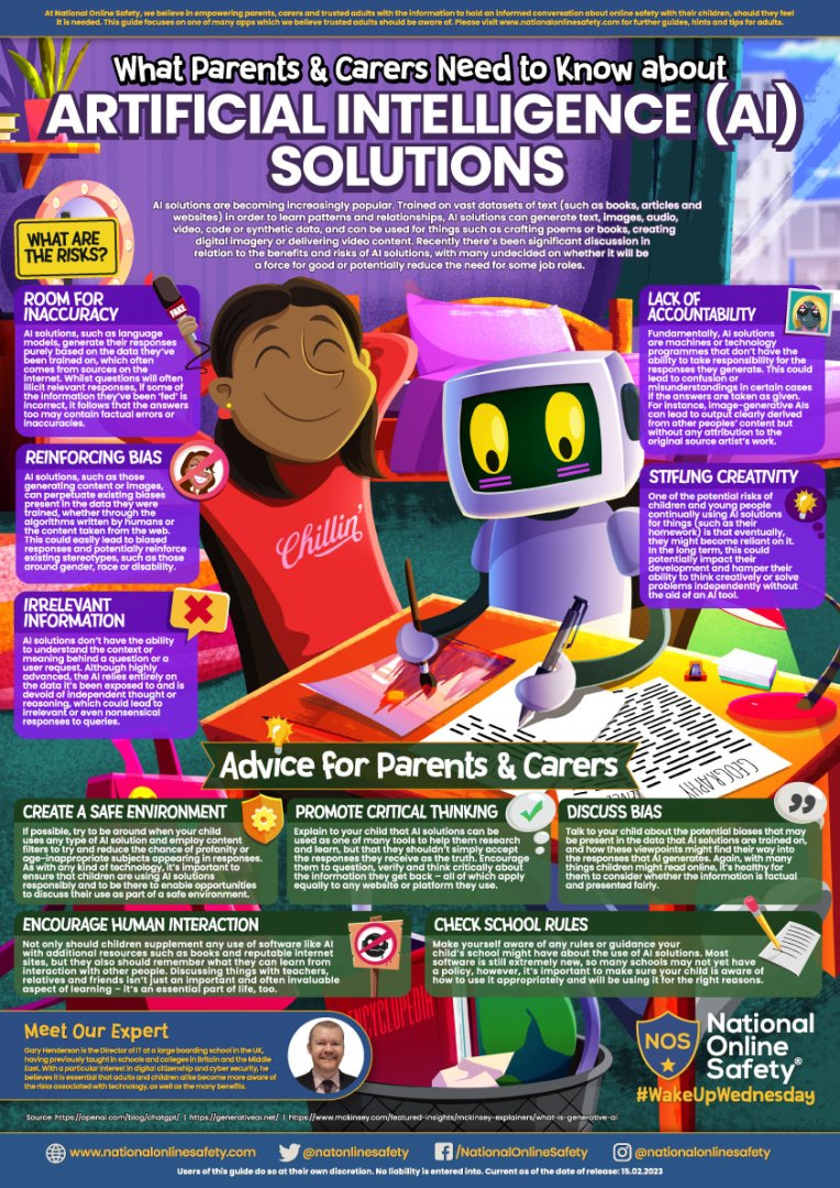 So how do artificial intelligence solutions work exactly? What kind of risks do they bring? Will they eventually negate the need for certain job roles, particularly in the creative industries? Our #WakeUpWednesday guide this week explains what AI solutions are and suggests ways parents and carers can support children to use the technology with an open mind. In the guide you’ll find tips on a number of potential risks such as inaccurate information, reinforcing stereotypes and what impact the technology might have on children’s creativity and problem-solving skills.