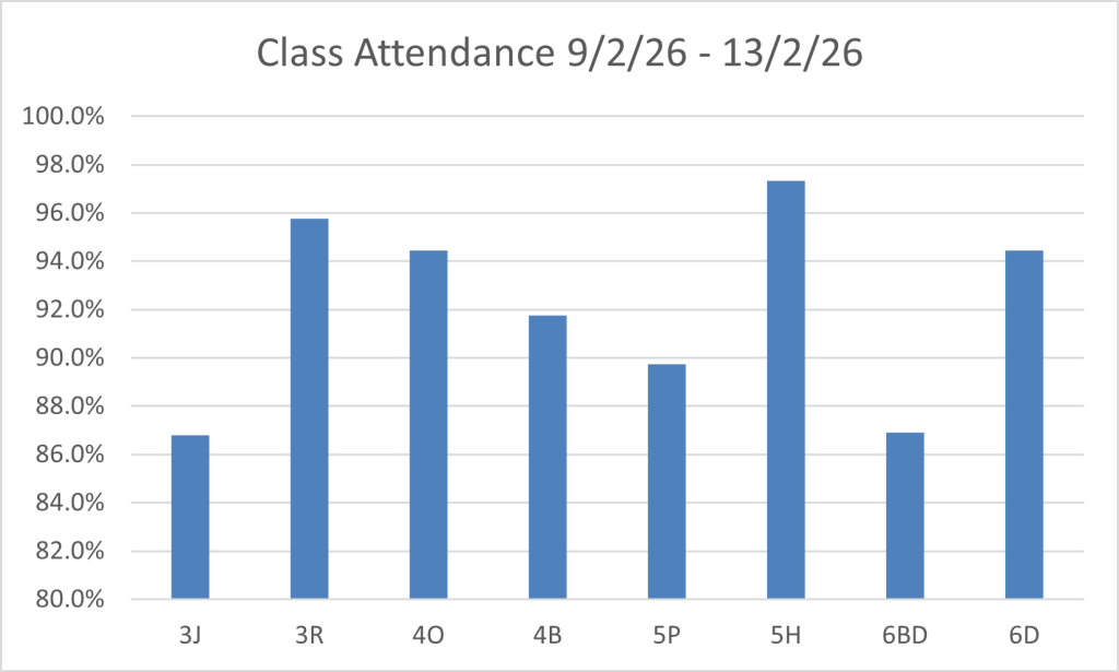 Class attendance winners 13/2/26 is 5H with an amazing 97.3%. Excellent work 5H
